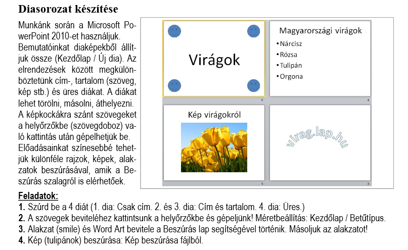 A prezentáció diakockáinak elkészítése sok szempontból megfelel a szövegszerkesztő oldalainak. Az előadó legegyszerűbb esetben kész sémák közül választhat