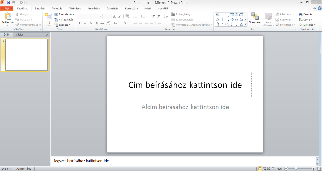 START / MINDEN PROGRAM / MICROSOFT OFFICE / MICROSOFT POWERPOINT 2010 útvonalon indítjuk. A program az alábbi képernyővel jelentkezik be: